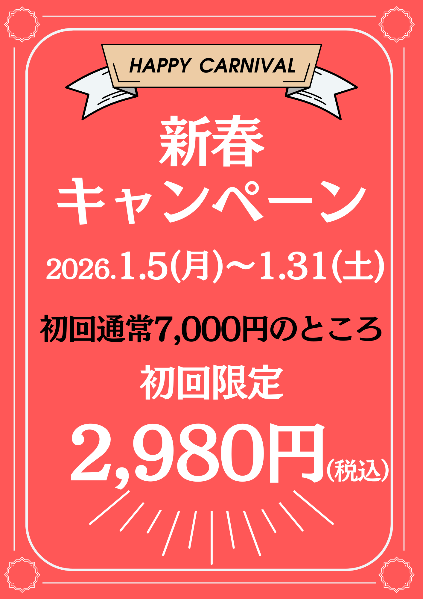 令和8年1月5日(月)~1月31日(土)初回通常価格7,000円(初見料2,000円+施術料5,000円:60分)のところ 初回限定:2,980円(税込) この機会に当院の施術をご体験ください! お問い合わせContact 0957-52-2523 受付時間 9:00-13:00/14:00~18:00[ 水・日・祝日除く ] メールフォーム こちらではご予約は受け付けておりません 返信は数日いただいております 公式LINE お知らせ