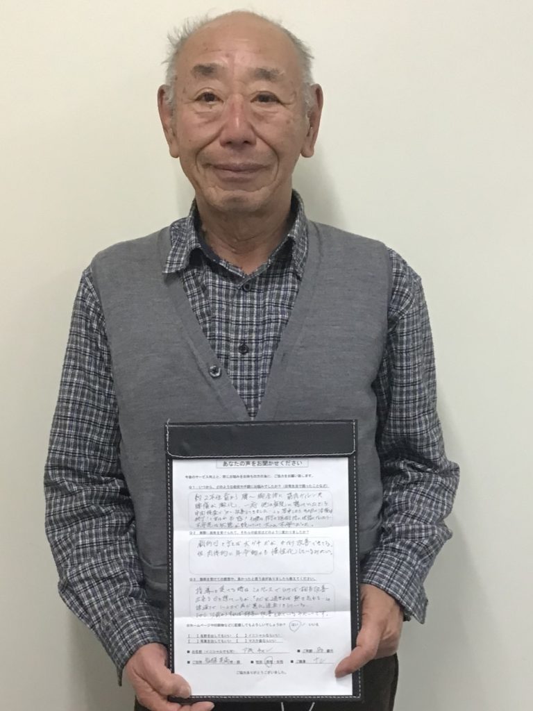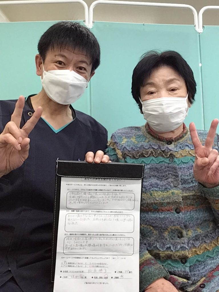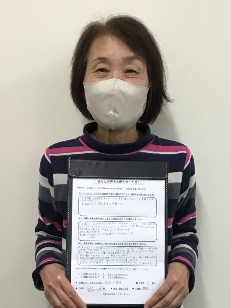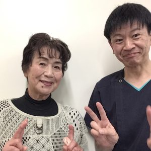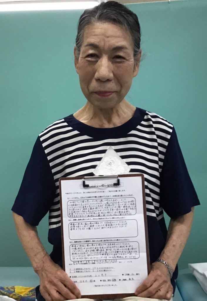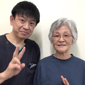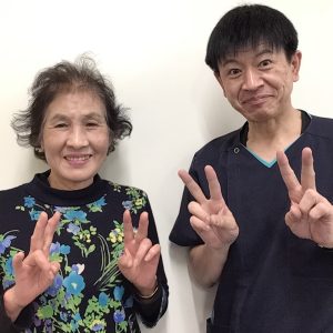 病院で車椅子生活になると言われ落ち込みましたが、田中先生の御指導により、1か月でトイレに歩いて行けるようになり、3か月後には入浴も1人で出来るように。今は料理と片付けも担当しています。杖は必要ですが元気です。
