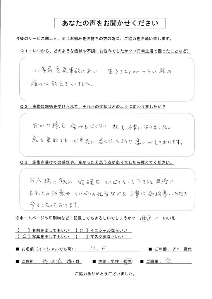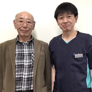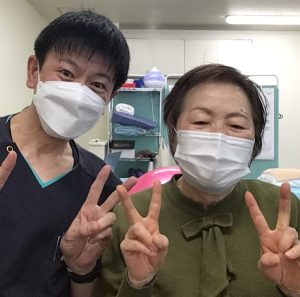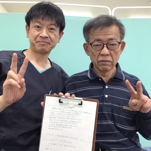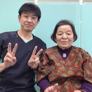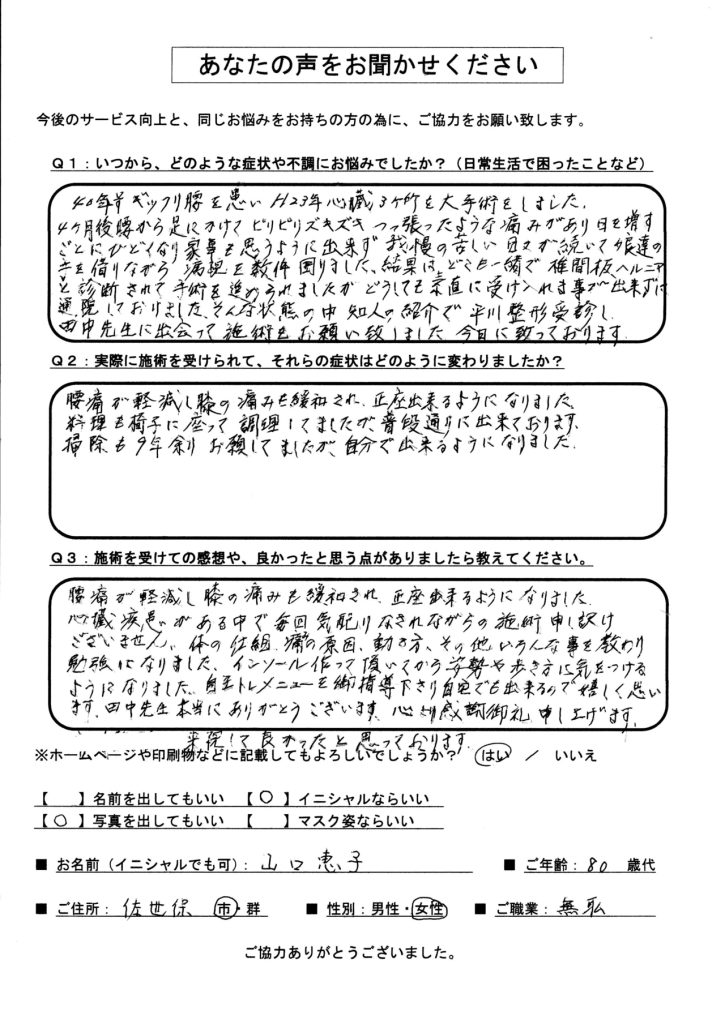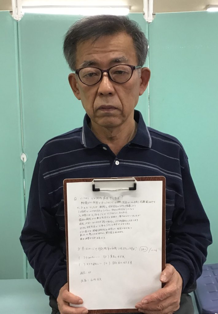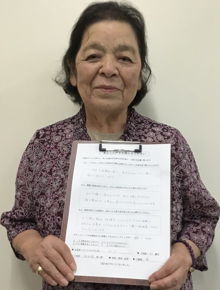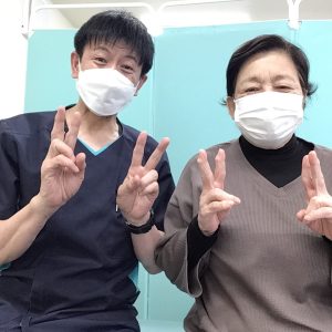 病院で車椅子生活になると言われ落ち込みましたが、田中先生の御指導により、1か月でトイレに歩いて行けるようになり、3か月後には入浴も1人で出来るように。今は料理と片付けも担当しています。杖は必要ですが元気です。