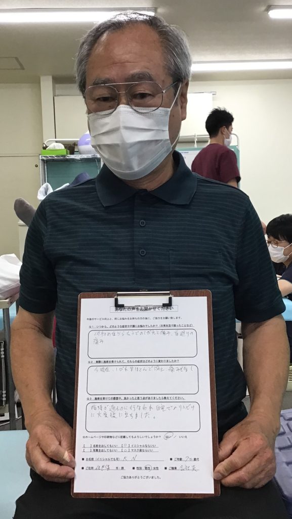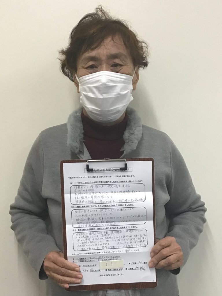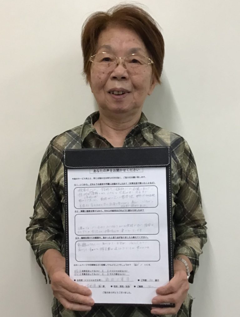 腰痛で階段の昇降、就寝時の寝返りも辛くなりました。田中先生は、痛みの原因、生活上の注意点、腰に負担の無い動作を教えてくれます。おかげで歩行に自信がつき、旅行へ行く回数が増えました。