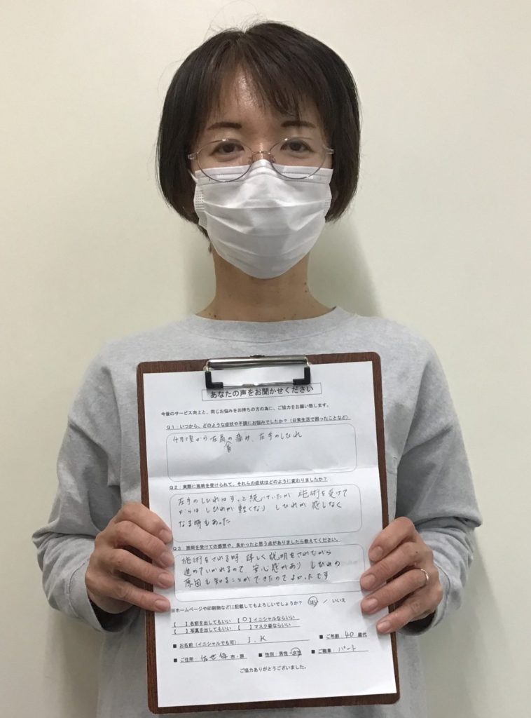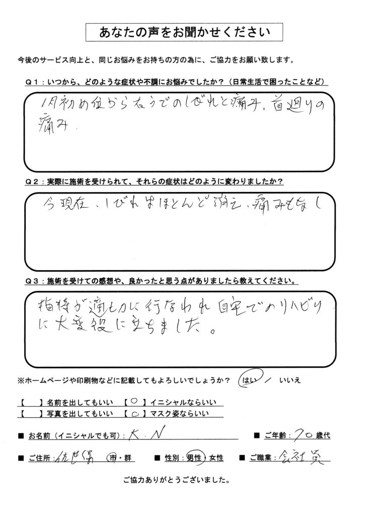 右腕と首回りのしびれと痛みがほとんど消えました。