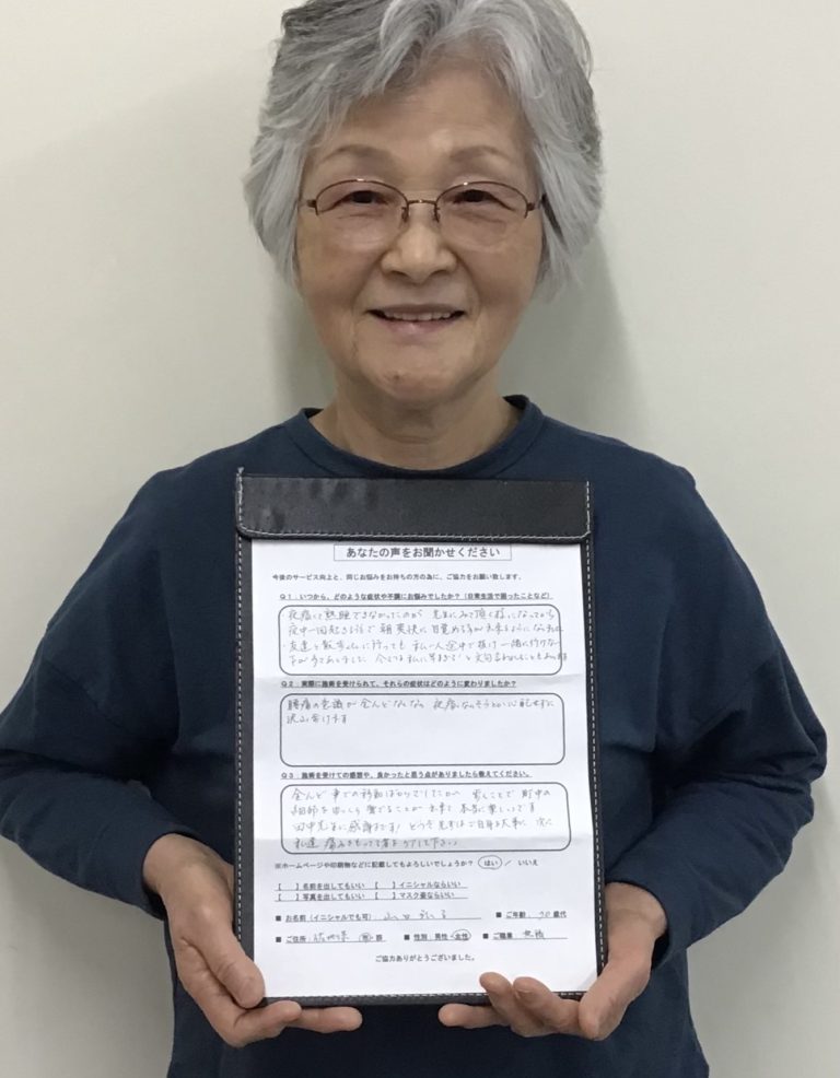 夜、腰が痛くて熟睡出来なかったのが、田中先生にみて頂いてから、良く眠れ朝爽快に目覚めるように。友達との散歩は、痛みで途中で抜けることが多々ありましたが、今では「早すぎる」と言われています。